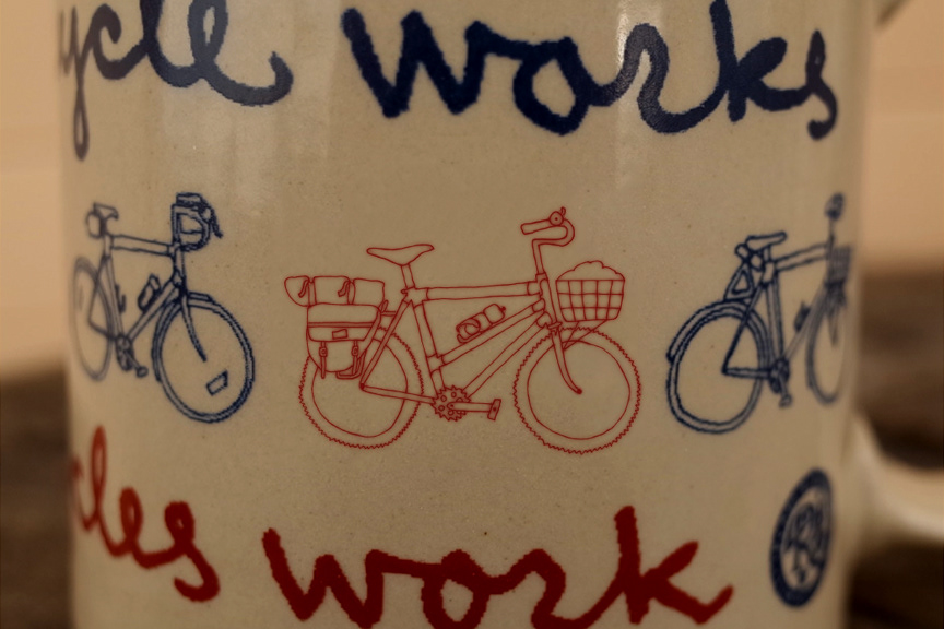 Rivendell Bicycle Works mug made by Red Wing Stoneware on the banks of the Mississippi River in Minnesota. Red Wing Stoneware has been making pottery since the mid 19th century so you can be sure you're getting a good mug. It has bicycle art on it and it holds liquids! Don't underestimate the thumb-perch either, you'll wish you had it on all your cups.